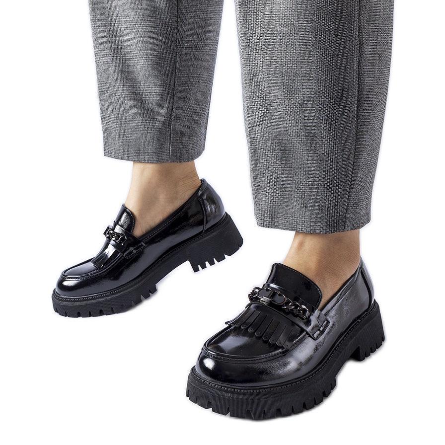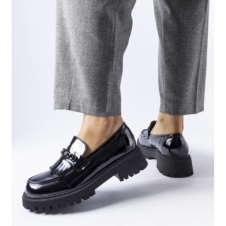 Agordinan mustat soljelliset patentoidut loaferit ovat täydellinen valinta naisille, jotka arvostavat eleganssia ja modernia tyyliä. Näille kengille on ominaista pyöreä kärki, joka antaa niille hienovaraisen klassisen ilmeen ja samalla erottuu muista malleista. Keskimäärin 5 cm korkea kantapää takaa käyttömukavuuden ja samalla lisää hieman tyylikkyyttä.