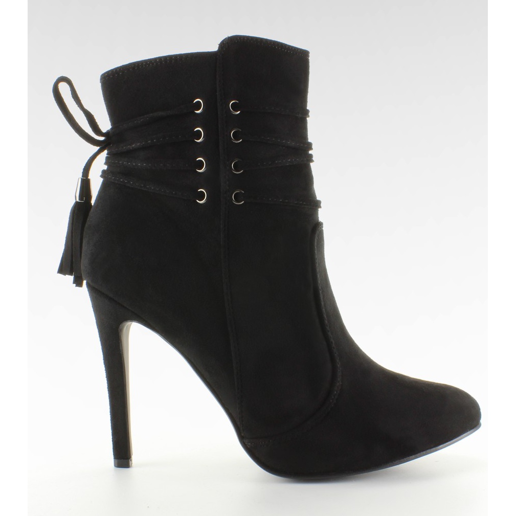 Korkeakorkoiset nilkkurit 4074 Black - sensuelli, elegantti ja käytännöllinen. Klassiset mustat saappaat, jotka on valmistettu ekologisesta mokkanahkasta, eriste on valmistettu herkästä turkista, täydelliset kylmempiin päiviin. 10 cm korkea stiletto kallistaa vartaloa, ja hienovaraiset nauhat hapsuilla nilkan ympärillä lisäävät tyylikkään aksentin. Sisäpuolella on vetoketju, joka helpottaa nopeaa pukemista.