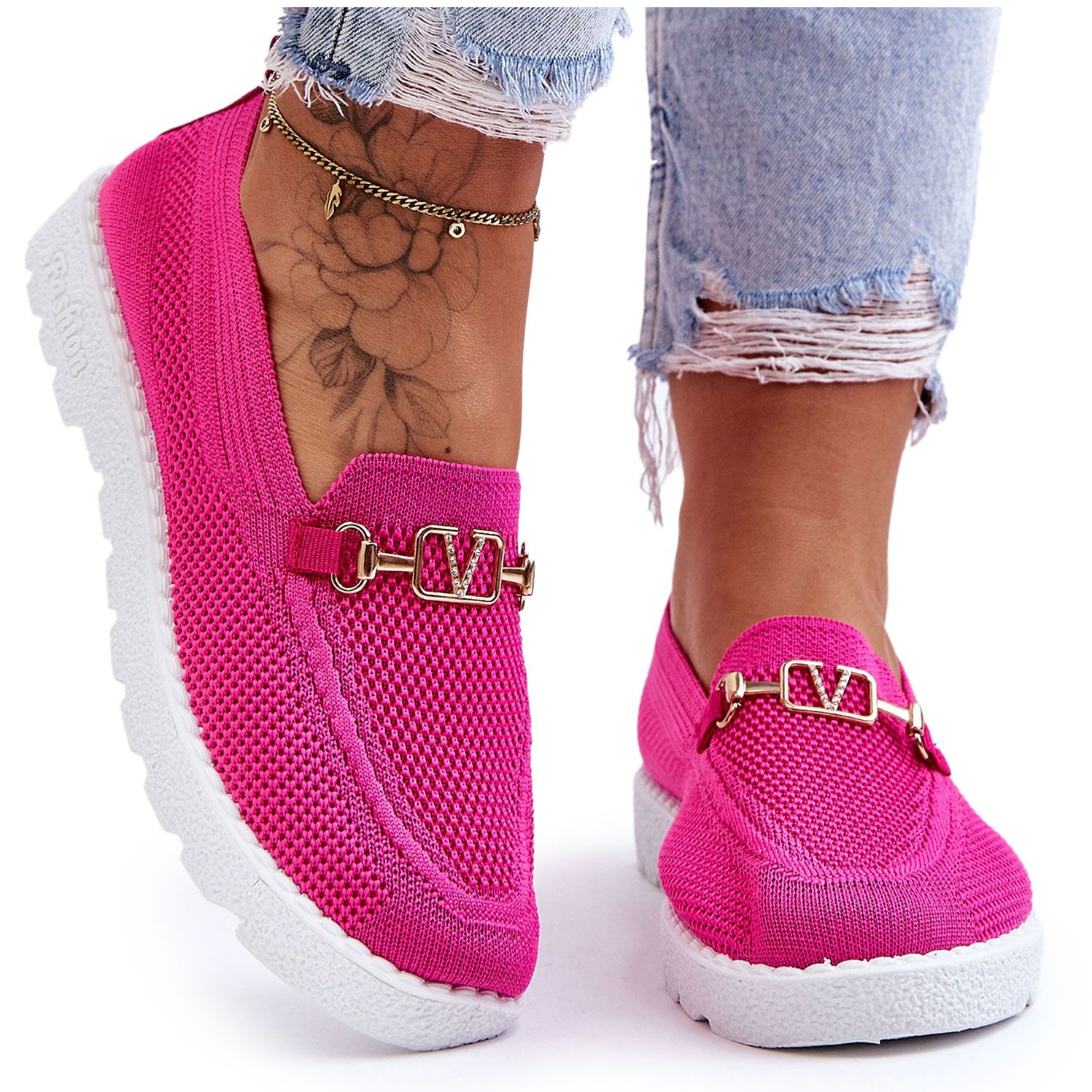Tyylikäs ja mukava liukua lenkkarit, jotka toimivat joka päivä - töihin, ostoksille tai tapaamiseen ystävien kanssa. Pehmeästä kankaasta valmistettu nilkan edessä oleva ylempi vaaleanpunaisessa sävyssä (persikka/fuksia), joka on koristeltu edessä kultaisella levityksellä strassilla, jotka jäljittelevät strassit. Lisätty rakenne ja litteä alusta varmistavat mukavuuden ja helppokäyttöisyyden.