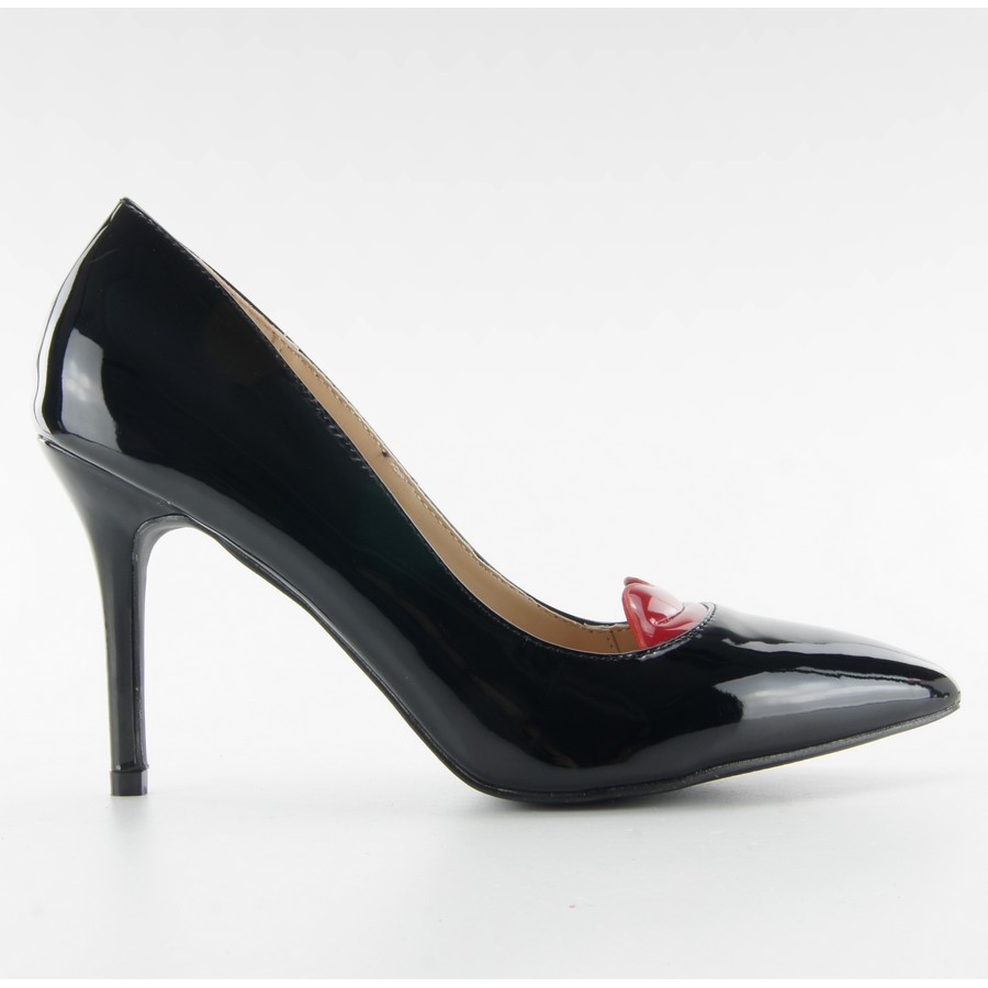 Alkuperäiset mustat pumput huulella - naisellinen asuste, joka herättää huomion. Lakattua klassisen mustaa päällistä täydentää erottuva aksentti punaisten huulten muodossa varpaassa, mikä antaa kengille alkuperäisen, muodikkaan luonteen. 9,5 cm korkea stiletto kallistaa vartaloa optisesti säilyttäen samalla elegantin, iltaisen tyylin.