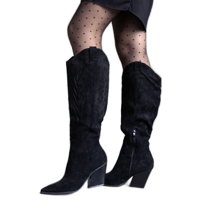 Kalasan korkeus polveen (48 cm) ja 7 cm: n korkokengät lisäävät eleganssia, ja eivät samalla rajoita liikkumisvapautta. Nahka -ekologisesta mokkanahasta valmistettu ulkoinen materiaali ei vain näytä houkuttelevalta, vaan on myös ympäristöystävällinen. Musta cowboy -saappaat tulevat varmasti monipuoliseksi elementti jokaisesta vaatekaapista.