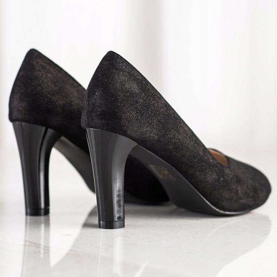 Pumppujen päällinen on valmistettu mustasta mokkanahkaa muistuttavasta materiaalista, joka hohtaa glitterillä ja lisää ainutlaatuista hehkua arki- ja iltamuotoiluihin. Avoimet varpaat ja pyöristetyt varpaat lisäävät kenkiin keveyttä ja eleganssia, mikä tekee niistä täydelliset kaikenlaisiin juhliin ja juhliin.