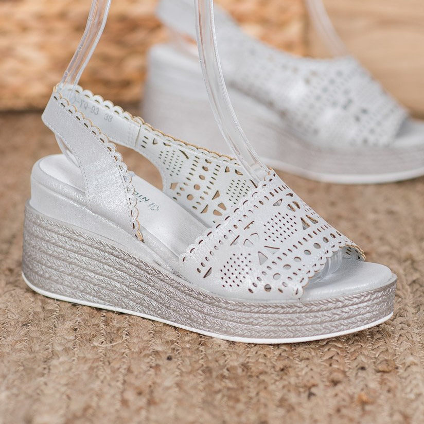 Sandaalien päällinen on valmistettu korkealaatuisesta materiaalista, joka jäljittelee harmaata nahkaa ja erottuu epäsymmetrisestä, harjatusta kuviosta, joka antaa jalkojen hengittää vapaasti myös kuumina päivinä. 7,5 cm korkea punottu kiila lisää luokkaa ja nostaa hellästi siluettia varmistaen samalla vakauden ja mukavuuden kävellessä.
