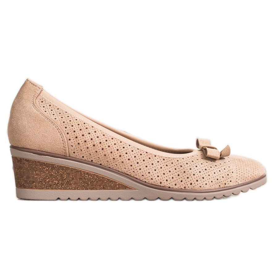 Pumpuissa on pyöristetty kärki ja sisäänrakennettu kantapää, mikä takaa mukavuuden jokapäiväisessä käytössä. Varpaiden yläpuolelle sijoitettu herkkä rusetti antaa niille hienovaraisuutta ja naisellista charmia. Lisäksi 5 senttimetrin kiila, joka on päällystetty korkkia jäljittelevällä materiaalilla, lisää korkeutta menettämättä vakautta.