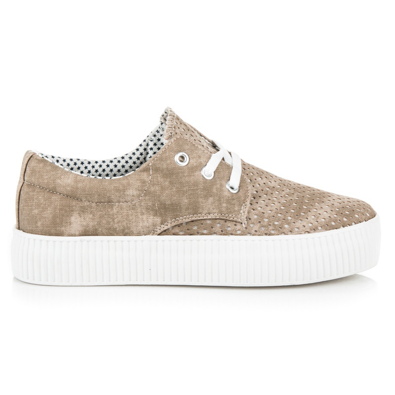 Ruskean värin ansiosta nämä lenkkarit sopivat täydellisesti moniin tyyleihin, sekä arki- että urheilutyyliin. Pyöreä kärki ja sisäänrakennettu pehmeä kantapää takaavat käyttömukavuuden, ja nauhakiinnitys mahdollistaa täydellisen istuvuuden jalkaan. Lavan korkeus 3,5 cm tarjoaa lisämukavuutta ja keveyttä rasittamatta jalkoja.