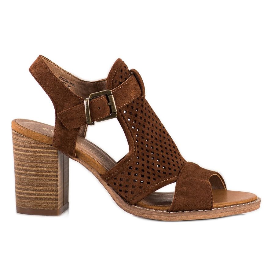 Tutustu Evento-brändin ruskeiden harjakattoisten sandaalien tarjoamaan eleganssiin ja mukavuuteen! Nämä ainutlaatuiset kengät ovat täydellinen valinta kevääseen ja kesään yhdistäen tyylin ja toimivuuden. Ne on valmistettu ekologisesta mokkanahkasta, ja niissä on klassinen leikkaus ja avoin kantapää, joka varmistaa hengittävyyden ja mukavuuden myös lämpiminä päivinä.