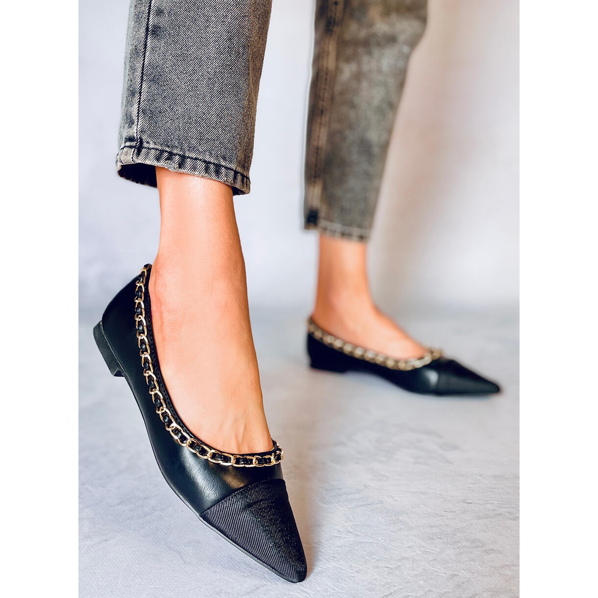 Löydä eleganssia ja mukavuutta ketjullisilla Sabina Black -balettiasuilla. Näissä ainutlaatuisissa naisten kengissä yhdistyvät ohut muotoilu ja herkkä terävä kärki, mikä antaa niille hienovaraisen mutta hienostuneen luonteen. Yläosan tyylikäs ketju on muodikas aksentti, joka varmasti herättää huomion.