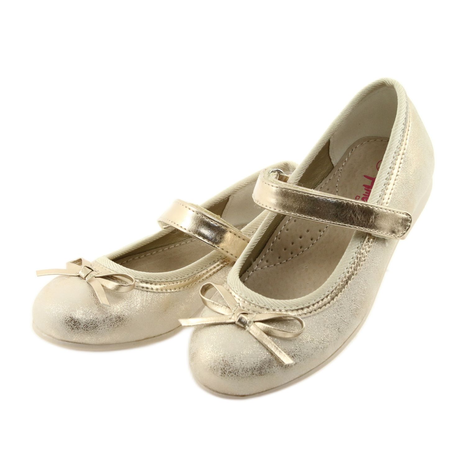 American Club GC18 ballerinapumput rusetilla ovat täydellinen valinta pienille eleganteille tytöille! Nämä kengät on valmistettu kauniista kullatusta beigenvärisestä eko-nahasta ja kullanrusetin muodossa, ja niissä yhdistyvät tyyli ja mukavuus.