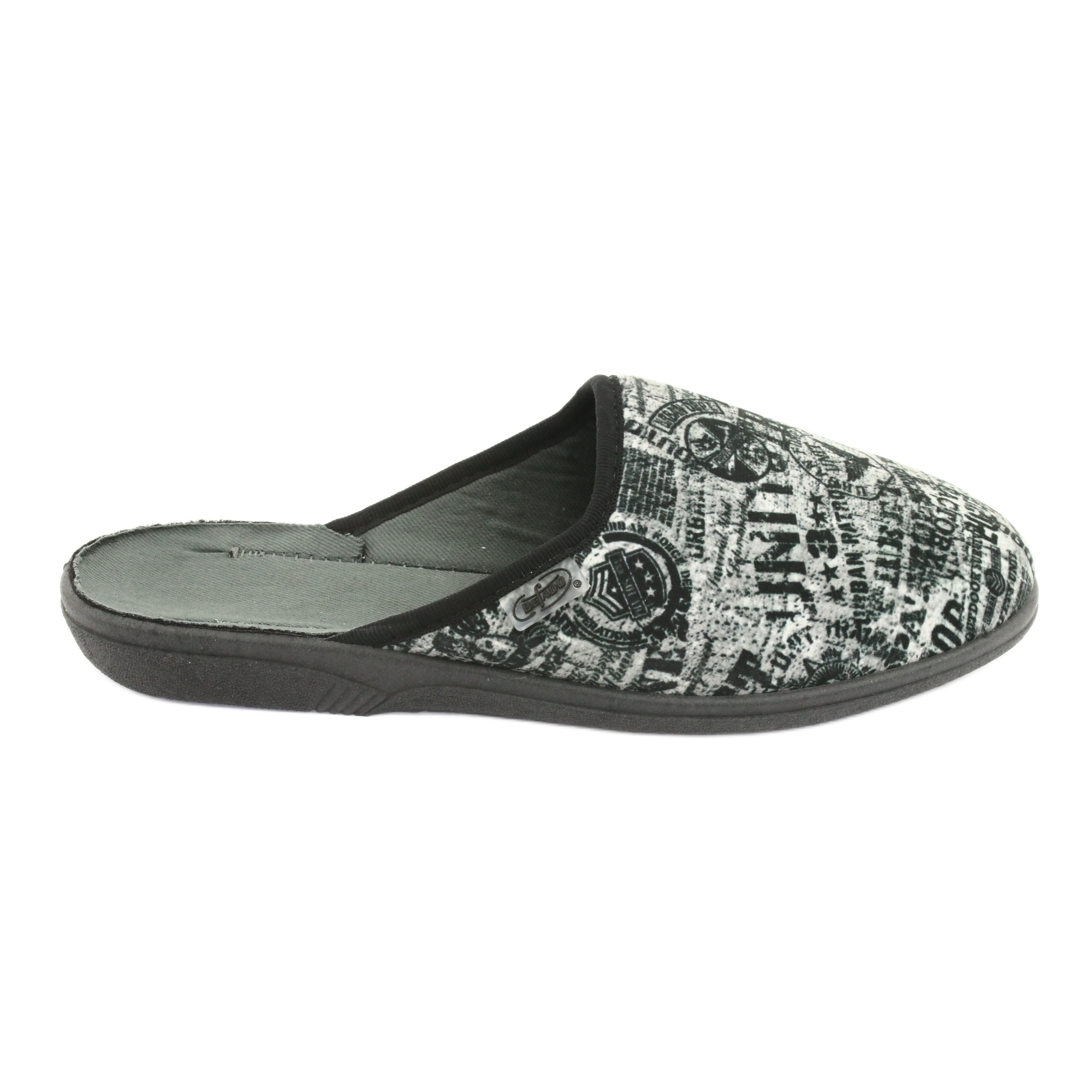 Käytännölliset, mukavat kodin tohvelit Befadosta - malli 201Q091 harmaavärinen tulosteilla. Liukuvat flip flops rakennetulla varpalla tarjoavat sormesi suojaamiseksi, ja kova pohja suojaa jalkoja kylmiltä jopa viileissä laattoissa. Pehmeä kankaan insertti lisää käytön mukavuutta ja tarjoaa hengittävyyden.