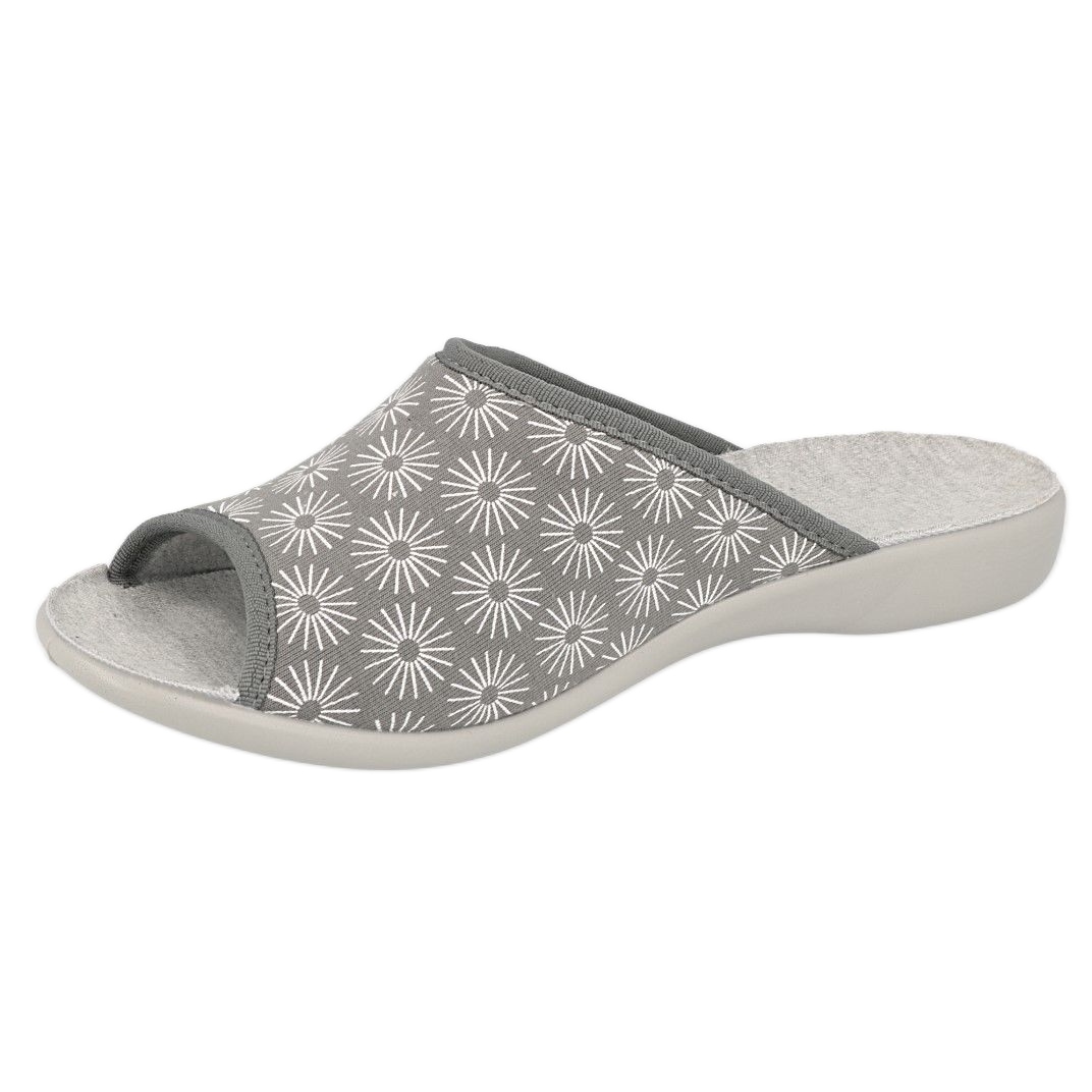 Tyylikkät ja käytännölliset naisten tohvelit Befado Viki on ihanteellinen ehdotus kotiin ja nopeasti ulkona. Harmaa materiaali, jolla on herkkä kuvio tähtiin, lisää viehätysvoimaa, ja universaali muotoilu saa ne toimimaan missä tahansa sisustuksessa.