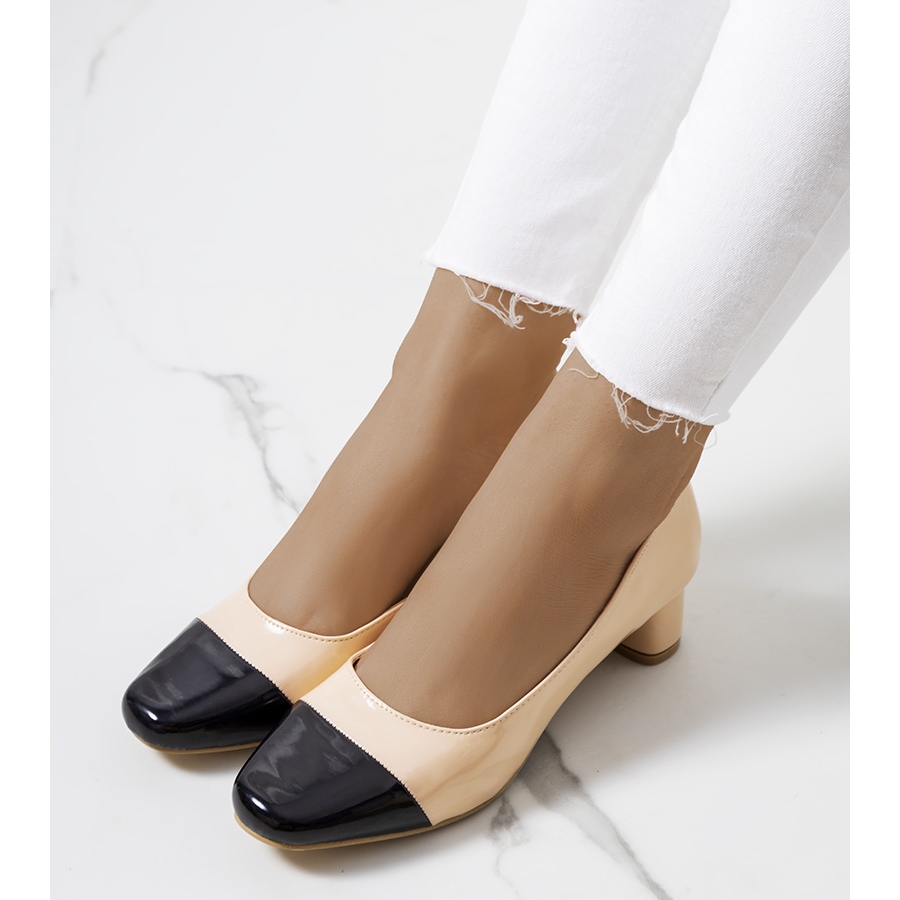 Mallissa on alkuperäinen, soikea tolppa, jonka korkeus on 4,5 cm, mikä takaa vakauden ja mukavuuden koko päivän ajan. Neliömäinen varvas antaa niille modernin luonteen, ja lakattu pinta kiinnittää huomiota ja sopii täydellisesti trendeihin. Beige väri mustilla korosteilla sopii moniin tyyleihin, sekä arki- että tyylikkäämpiin.