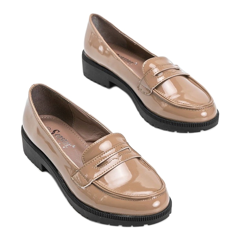 Sisin beige-kiiltonahkaiset loaferit ovat täydellinen valinta naisille, jotka haluavat yhdistää eleganssin ja mukavuuden. Nämä tyylikkäät paksupohjaiset kengät on valmistettu ekologisesta kiiltonahasta, mikä tekee niistä ainutlaatuisen näköisiä. Niiden klassinen muotoilu on yhdistetty moderniin viimeistelyyn, mikä tekee niistä erinomaisen valinnan jokapäiväiseen käyttöön.