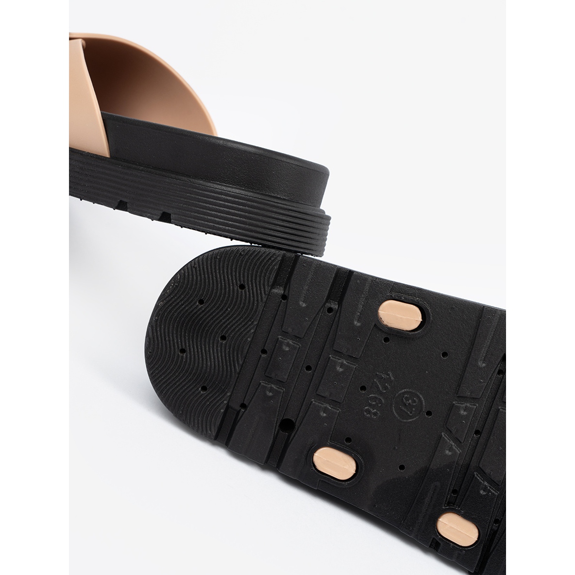 Valmistettu korkealaatuisesta ekologisesta nahasta, flip -Flops -takaa kestävyyden lisäksi myös puun mukavuuden. Saman materiaalin pehmeä insertti tarjoaa mukavuutta koko päivän ajan, ja avoin kantapää tekee läpän asettamisesta ja poistamisesta nopeasti ja yksinkertaisesti. Litteällä kantapäällä, jonka korkeus on 2,5 cm, nämä läppä on hienoja joka päivä tarjoamalla tarvitsemasi mukavuuden.