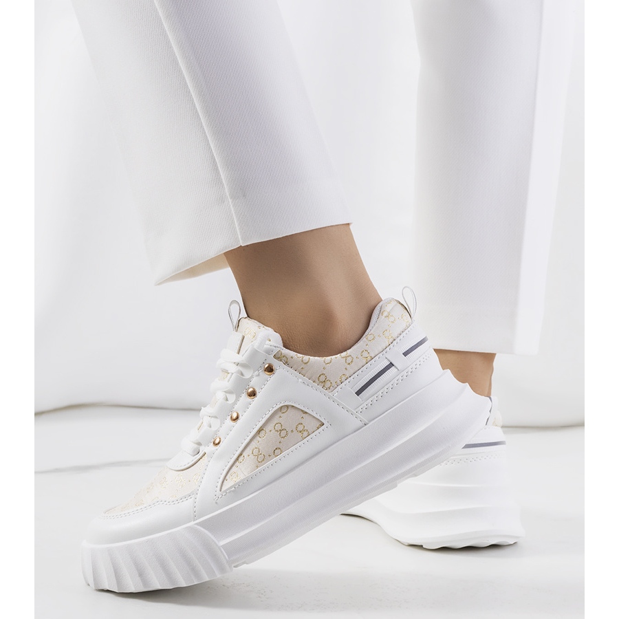 Niiden korkea, 3,5 cm korkea pohja kalentaa jalkoja optisesti ja tekee jokaisesta tyylistä kevyen. Beigen ja valkoisen värin ansiosta tennarit sopivat täydellisesti erilaisiin asuihin, rento ja tyylikkäämpiin.