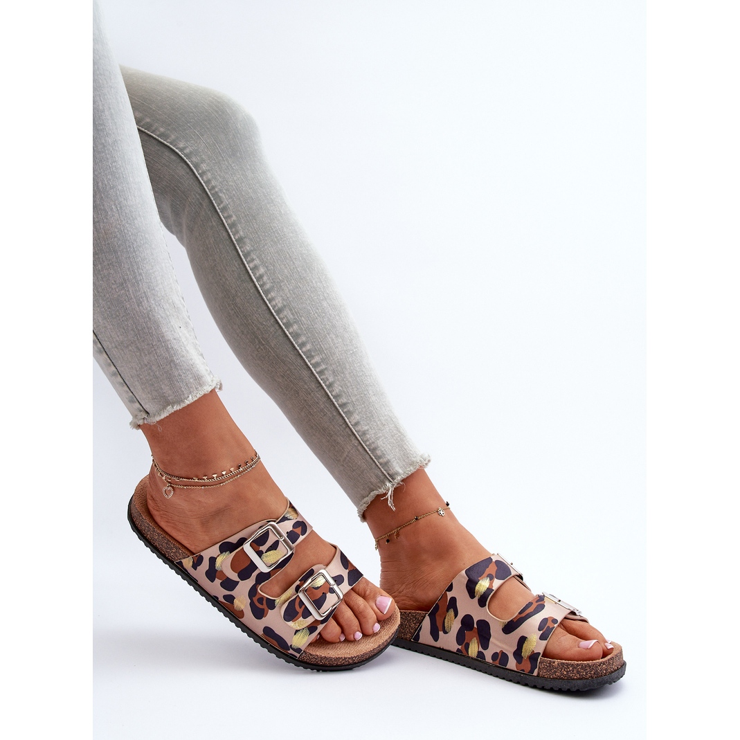Yksityiskohdat: Beiget ja ruskeat naisten varvastossut, joissa soljet Oliena