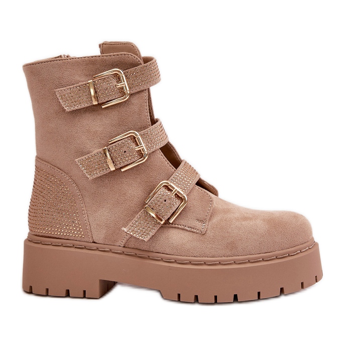 Ekologisesta mokkanahasta valmistettu saappaat erottuvat beigeväristä, jonka voit helposti yhdistää erilaisiin tyyliöihin. Heillä on upeita raitoja, jotka on koristeltu kultaisilla solkilla, jotka antavat heille modernin hahmon. Vetoketjun ansiosta jalkineiden asettaminen ja poistaminen muuttuu yksinkertaisemmaksi kuin koskaan.