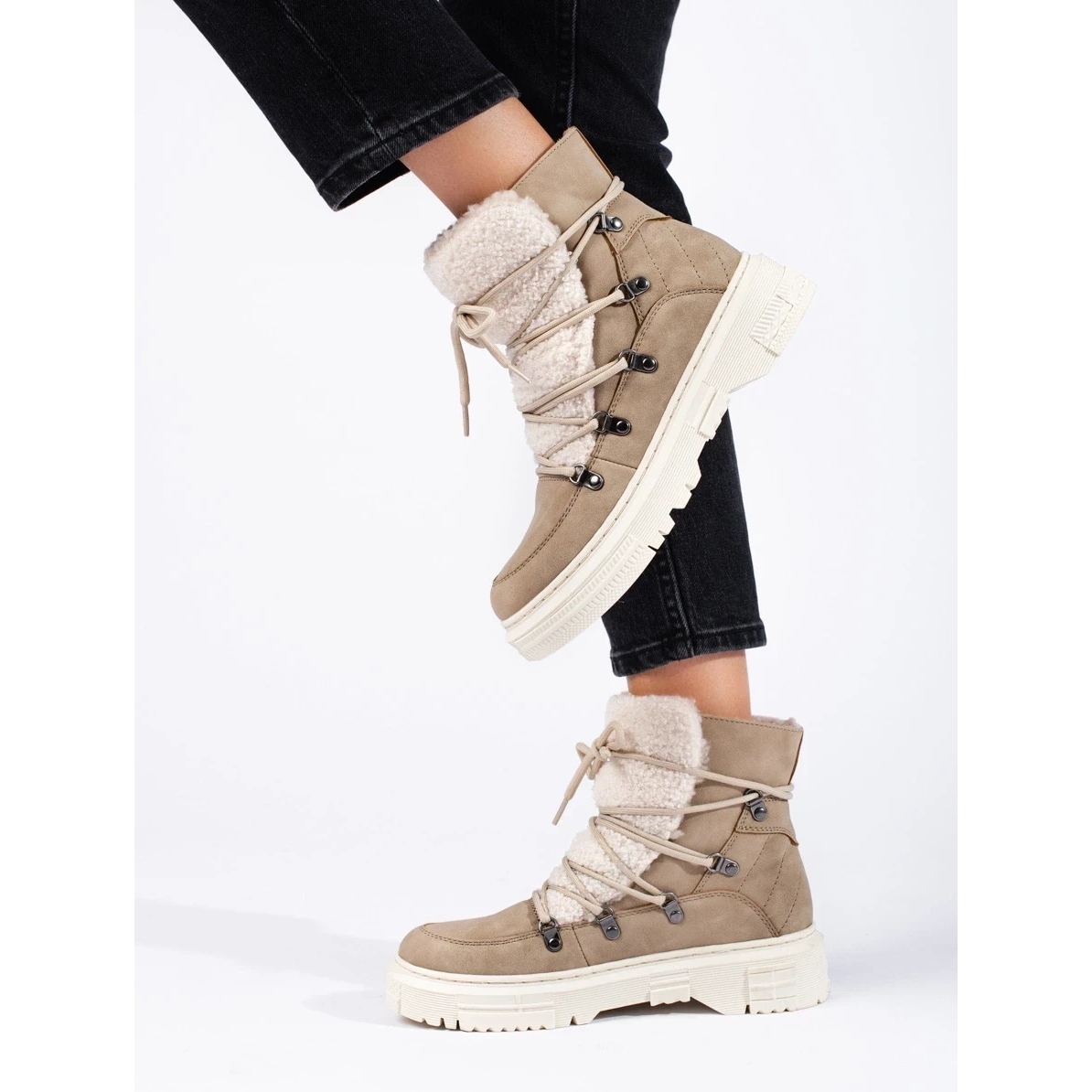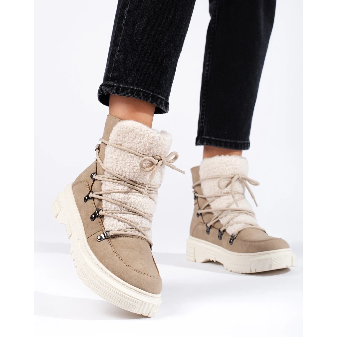 Beige -lumikengät, joissa on lampaannahka, yhdistävät mukavuuden ja muodikkaan ilmeen. Pehmeä, eristetty insertti ja tekstiilisisät takaavat lämpöä ja mukavuutta matalissa lämpötiloissa. Ekologinen nahan yläosa on helppo ylläpitää ja kestää likaa, ja rakennettu -jäykistetty Fester vakauttaa jalan kävellessä. Lace -UP: n avulla voit säätää ylemmän leveyttä tarpeitasi. Kiinteä pohja selkeällä kulutuspinnalla parantaa tarttuvuutta liukkailla pinnoilla.
