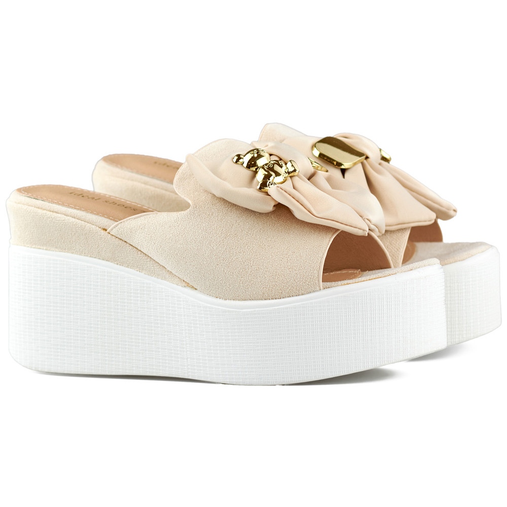 Löydä ainutlaatuiset beige-naisten flopsit nallekarhun ja keulan kanssa kiilassa, josta tulee välttämätöntä kesäkaapissasi! Nämä tyylikkäät flip flops hyvämaineisesta tuotemerkistä, jotka on valmistettu korkealaatuisesta ekologisesta mokkanahasta, yhdistävät tyylin ja mukavuuden, joka sopii täydellisesti päivittäin.