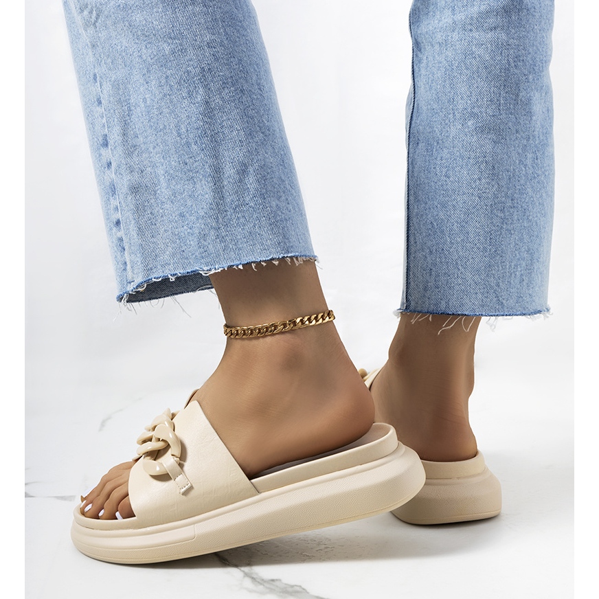 Niiden korkea kumipohja ei ainoastaan takaa mukavuutta, vaan myös näyttää poikkeuksellisen tyylikkäältä, minkä ansiosta Levy-varvastossut sopivat täydellisesti erilaisiin kesäasuihin. Lisäetuna on muodikas ketju, joka koristaa päällisen, mikä antaa niille ainutlaatuisen luonteen.