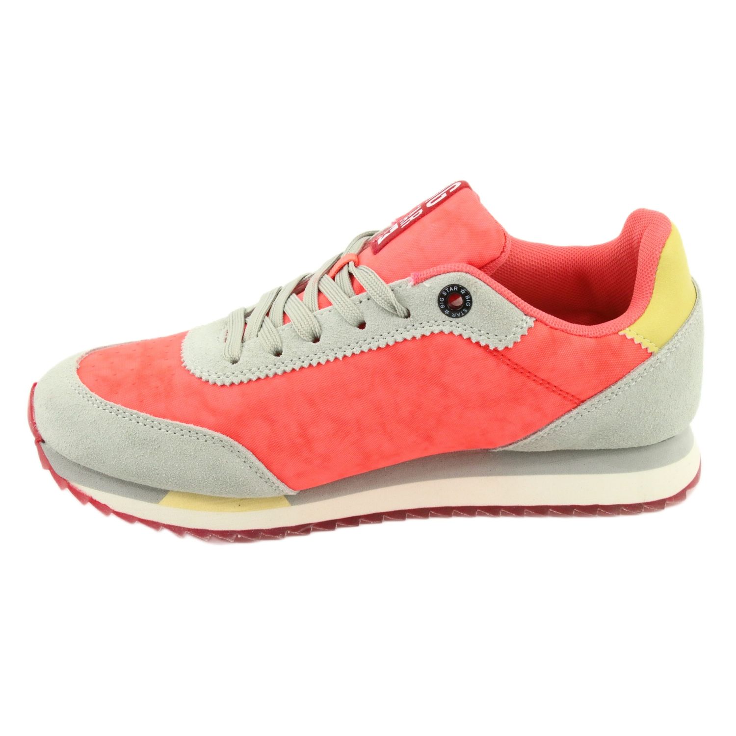 Moderni, mukava ja tyylikäs Big Star Sneakers, FF 274873 -malli, yhdistä urheilullinen hahmo hienovaraiseen eleganssiin. Valmistettu ekologisesta nahasta ja tekstiilimateriaalista energisen oranssin sävyn kanssa harmaiden korostusten kanssa - ne täydentävät täydellisesti päivittäisiä ja rentoja sarjoja.