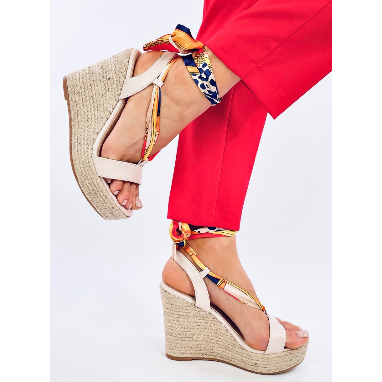 Jalkaa koristava värikäs huivi antaa kokonaisuudelle sensuellin luonteen, ja pellavaviimeistely lisää raikkautta ja vapautta jokaiseen kesätyyliin. Sandaalit on valmistettu korkealaatuisista materiaaleista: kankaasta ja ekologisesta nahasta, mikä takaa kestävyyden ja käyttömukavuuden.