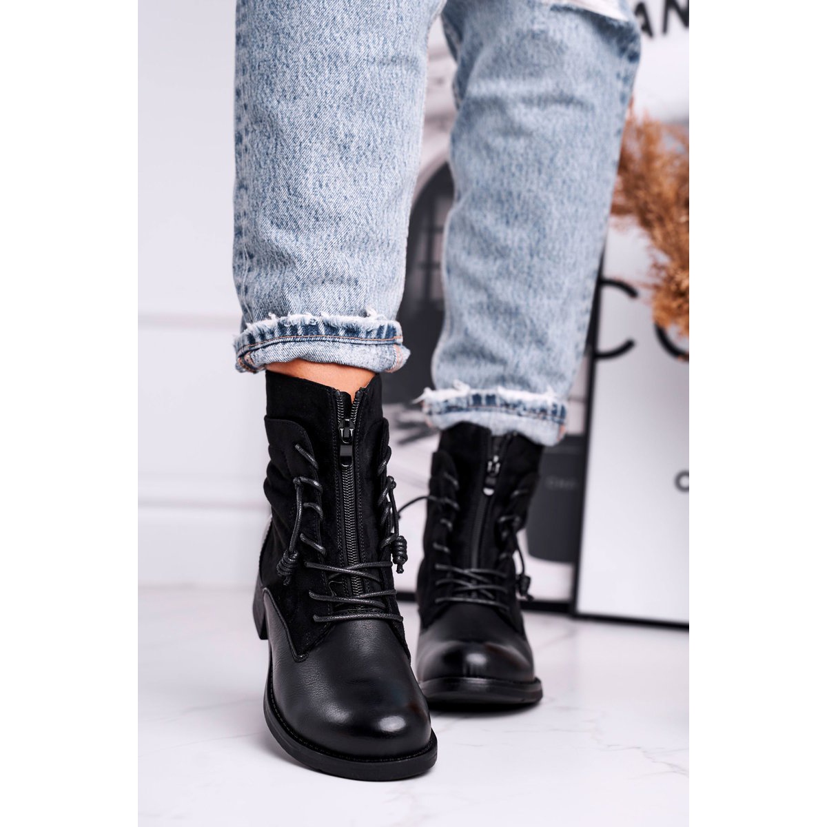 Saappaiden sisäpuoli on peitetty lämpimällä, miellyttävällä kosketuksella kenkäpeitolla, joka pitää sinut lämpimänä myös kylmimpinä päivinä. Se on täydellinen valinta kylmempään vuodenaikaan, kun haluat näyttää muodikkaalta, mutta samalla tarvitset tehokkaan suojan kylmää vastaan. Saappaat on varustettu yhdellä vetoketjulla, joka sijaitsee kielen lähellä, mikä tekee niiden pukemisesta ja riisumisesta helppoa.