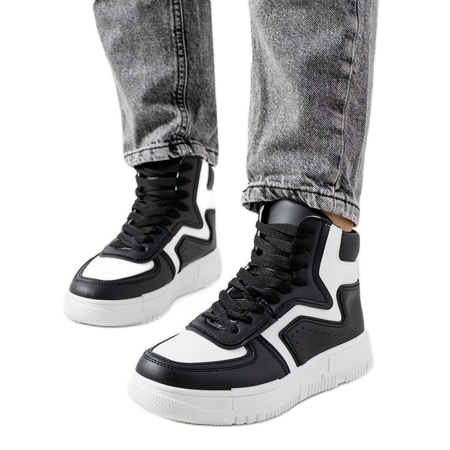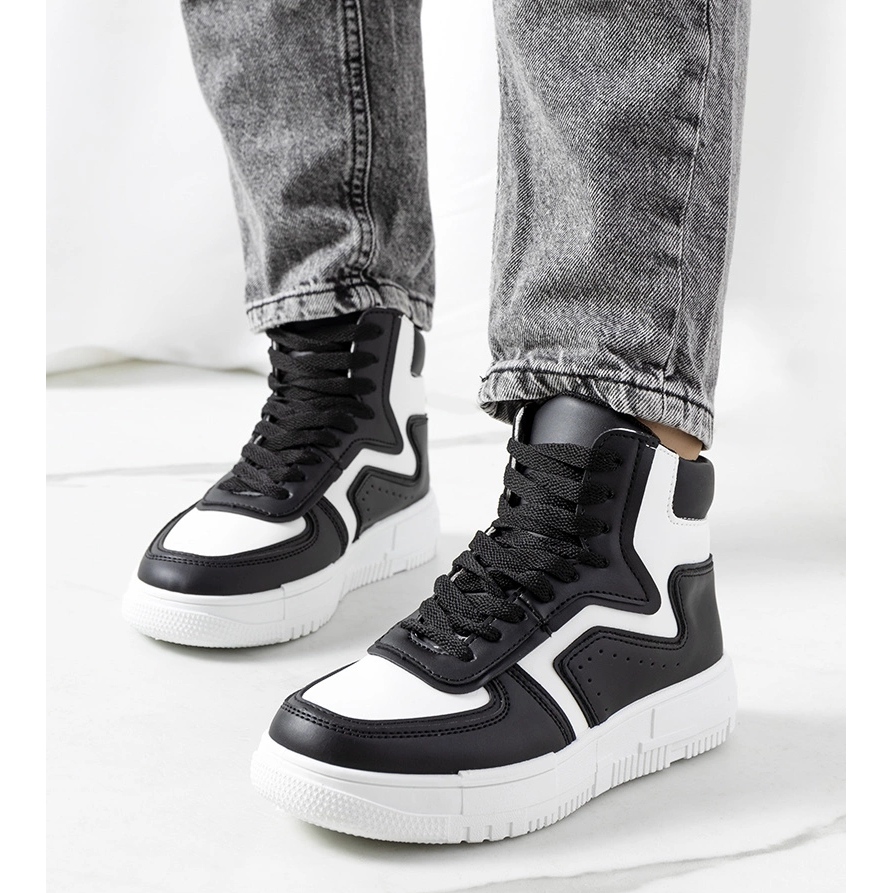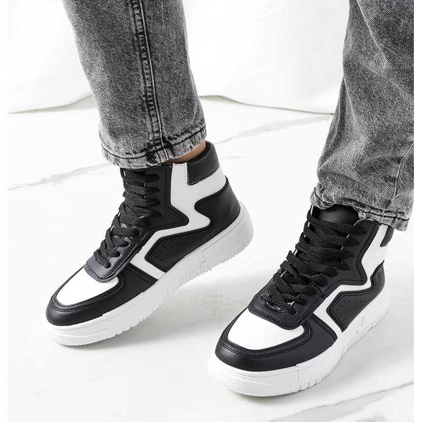 Roseda Black Sneakers - tyylikäs, mukava ja universaali. Korkea leikkaus täydentää täydellisesti sekä satunnaisia että kaupunkialueita, naisellisia tyyliä. Valkoinen, paksumpi pohja (noin 3 cm) antaa kengille muodikkaan luonteen ja optisesti pidentää jalkoja, ja ekologisen nahan suorituskyky varmistaa mukavuuden koko päivän.