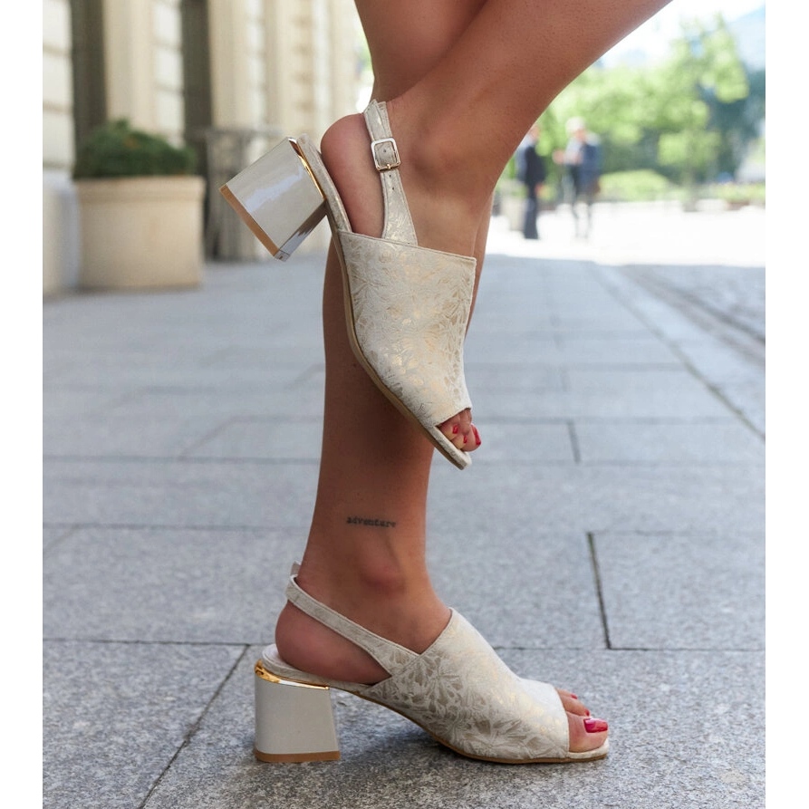 Sandaalit lohkossa, jossa on nunan nahkainen insertti beige -sävyssä, ovat loistava valinta kesäpäiviin, yhdistäen mukavuuden ja muodikkaan muotoilun. Heidän klassinen muoto korkeassa, vakaan kantapäässä, jonka korkeus on 5,5 cm, tekee niistä paitsi mukavia, myös lupaavat tyylikkyyttä jokaisessa tyylityksessä. Ekologisesta mokkanahasta valmistettu nämä sandaalit eivät vain näytä kauniilta, vaan myös huolehtivat ympäristöstä. Nahkisäke tarjoaa korkean mukavuuden, ja solki antaa sinun mahtua helposti jalkaan.