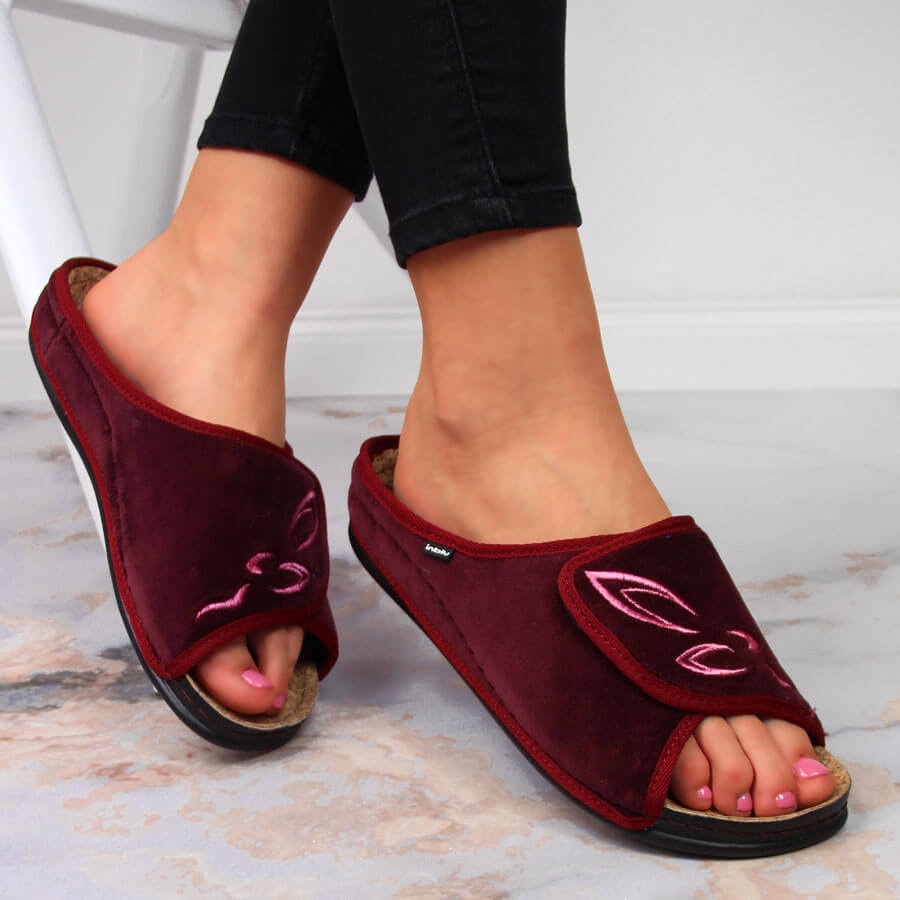 Yksityiskohdat: Burgundy Inblu, tarranauha, naisten kotitossut punainen