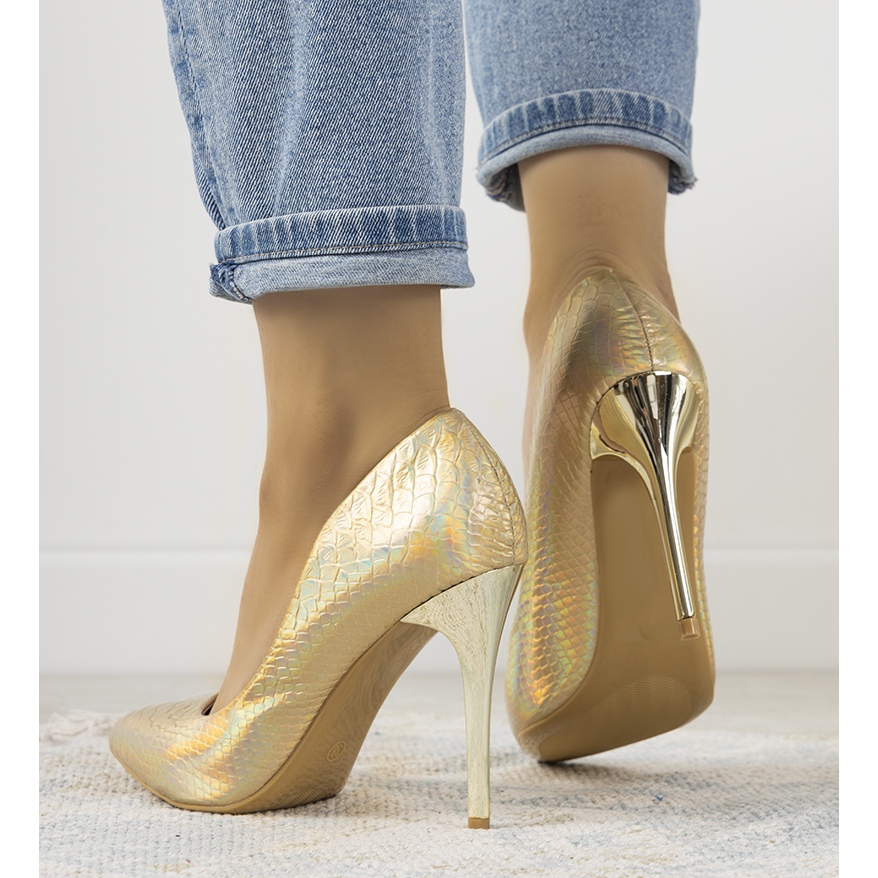 Löydä poikkeuksellista eleganssia ja hieman kiiltoa kultaisilla holografisilla Craigie-korkokengillä! Nämä ainutlaatuiset pumput ovat täydellinen valinta mihin tahansa tapahtumaan, ja ne herättävät huomiota omaperäisyydellään ja ainutlaatuisella viimeistelyllään. Holografinen pinta saa jokaisen askeleen säteilemään taikuutta, ja hienovaraiset valon heijastukset lisäävät ainutlaatuista luonnetta.