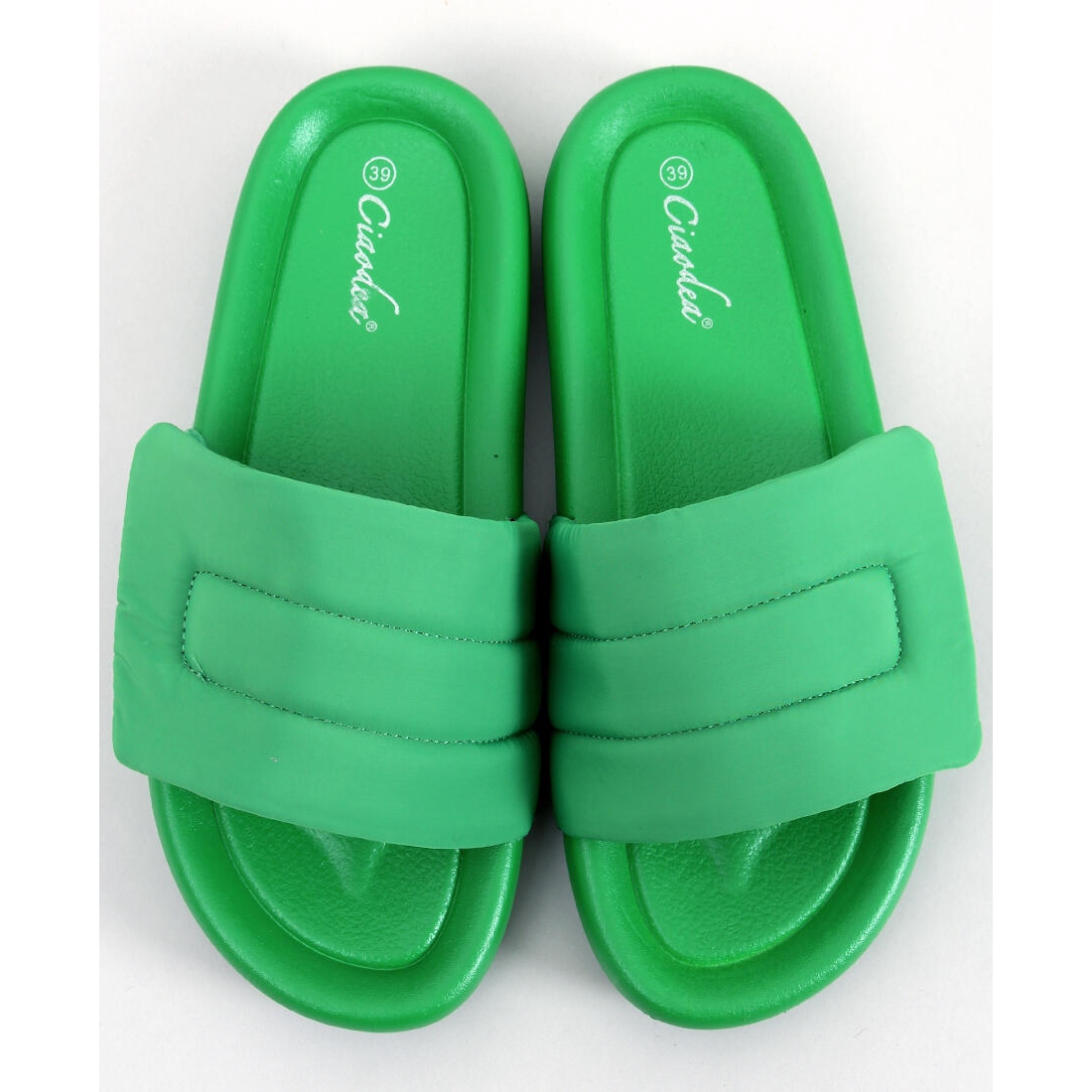 Cueto -vihreät läpät erotetaan leveällä tarranauhalla, joka tarjoaa täydellisen istuvuuden ja vakauden, jolloin jalka voi liikkua vapaasti. Kumiprofiilista valmistettu profiloitu sisäinen insertti takaa mukavuuden, jopa pitkän käytön aikana, ja tasainen kantapää, jonka korkeus on 2,5 cm, tekee niistä täydellisiä mihin tahansa tilanteeseen.