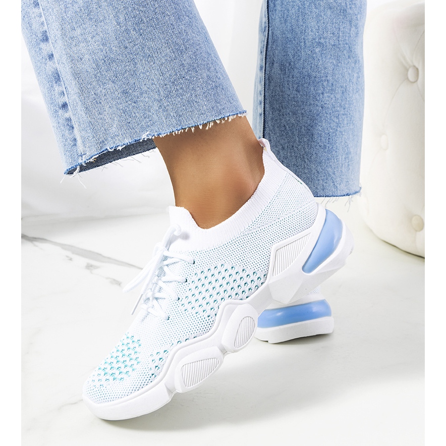 Kengät ovat matalat, mikä takaa käyttömukavuuden ja niiden korkeus on vain 11,5 cm. Laadukkaasta kumista valmistettu pohja on kestävä ja kulutusta kestävä, ja kangaspohjallinen materiaali lisää mukavuutta. Kokonaisuutta täydentävät pyöreä nenä ja moderni muotoilu valkoisen ja sinisen sävyissä, jotka sopivat täydellisesti nykytrendeihin.