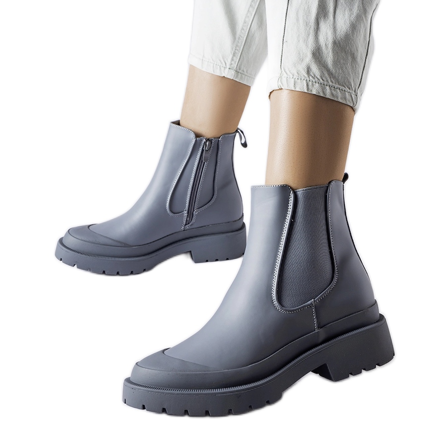 Keeshoes -kokoelman tyylikkäät harmaat dettisaappaat yhdistävät muodikkaan ilmeen käytännöllisiin ratkaisuihin. 5 cm: n alustan ansiosta ne lisäävät muutaman senttimetrin menettämättä vakautta, ja sivulukko helpottaa asettamista. Täydellinen universaalina elementtiä päivittäisissä tyylien tyylillä farkut, mekot tai hameet.