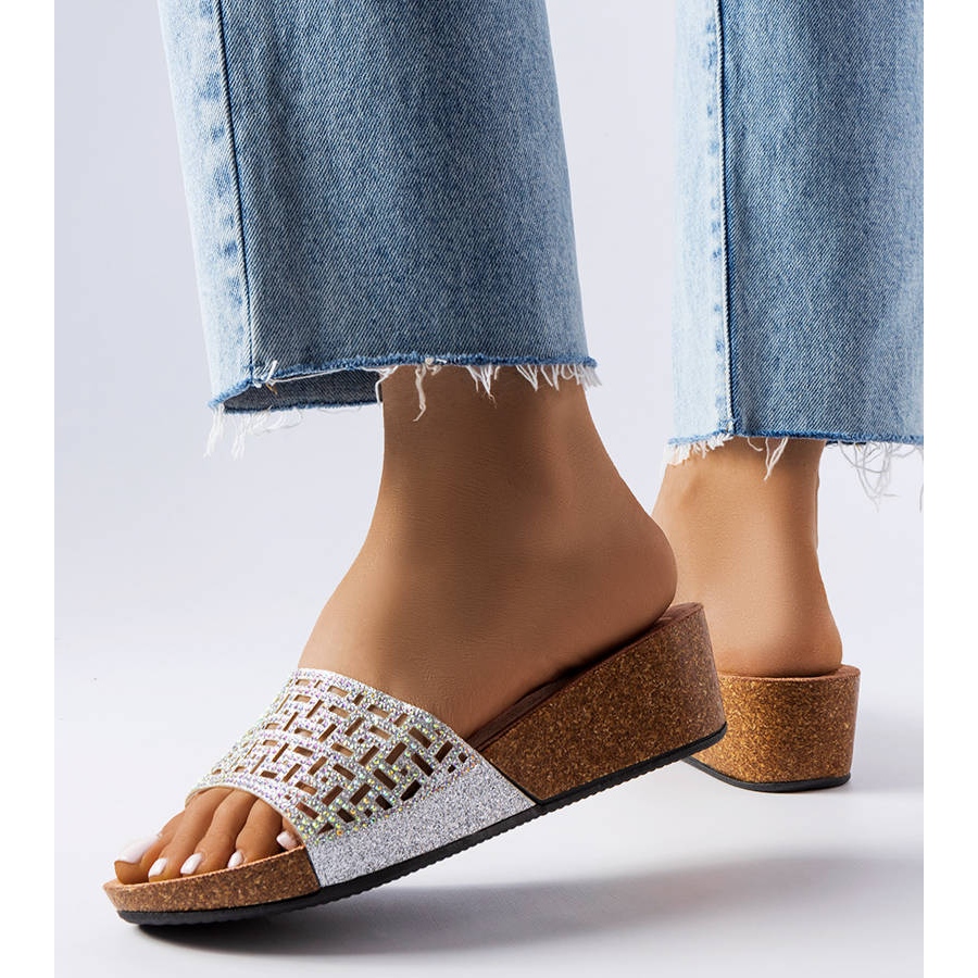 Elithan varvastossut erottuu paksusta kuminauhasta, joka on koristeltu kiiltävällä zirkonialla, joka heijastaa kauniisti valoa ja kiinnittää huomiota. Pohjaa täydentää kiilapohja, joka paitsi korostaa kauniisti jalkoja, myös takaa mukavuuden käytössä. Ruskea muovipohja erottuu hopeanvärisestä viimeistelystä antaen kengille alkuperäisen luonteen.