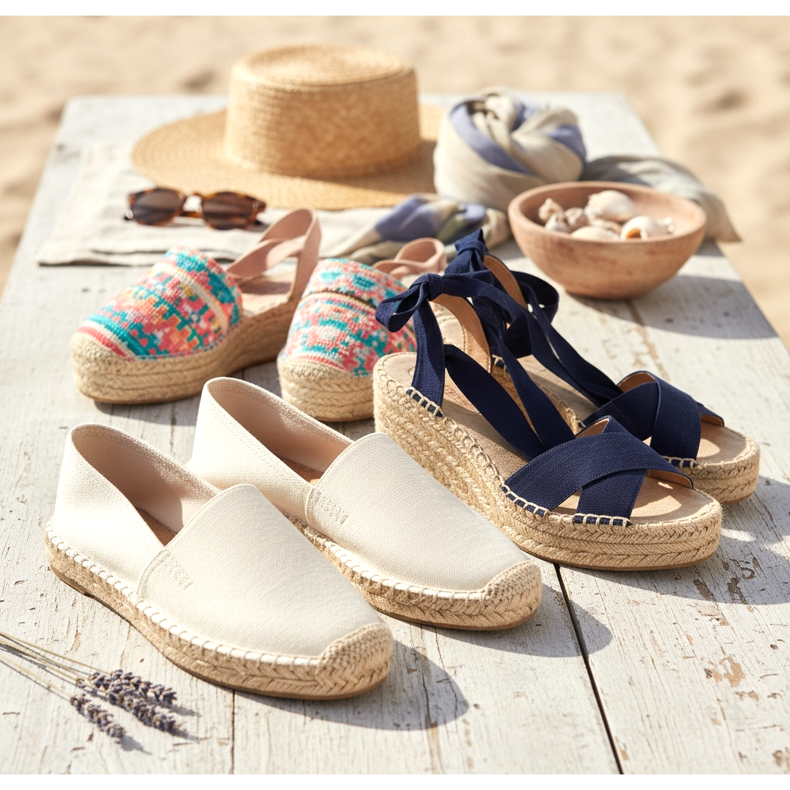 Espadrillit ovat erittäin monipuolisia. Litteät mallit sopivat täydellisesti rannalle, kävelylle merenrantakadulle ja jokapäiväiseen retkeilyyn. Käytä niitä pellavahousujen, farkkuhousujen ja väljien mekkojen kanssa. Valkoiset tai beige-espadrillit luovat harmonisen kaksikon pastelliväreillä ja merenkulkutyylillä.