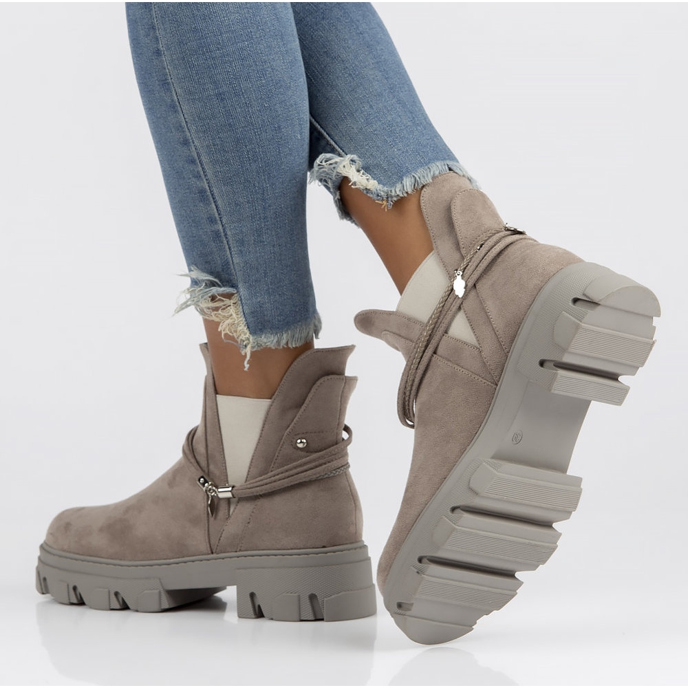 Mielenkiintoinen aksentti ovat koristeelliset ketjut, jotka herättävät huomiota ja antavat kengille luonnetta. Saappaiden sisäpuoli on vuorattu materiaalilla, mikä mahdollistaa miellyttävän käytön ilman epämukavuutta. Neutraalin värin ansiosta nämä harmaat nilkkurit voidaan yhdistää helposti useisiin tyyleihin, niin arkisiin kuin hieman tyylikkäämpiinkin.