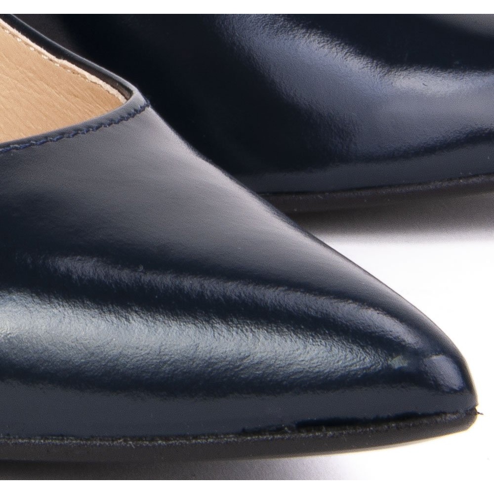 8,5 cm:n kantapään korkeudella nämä korot lisäävät tyyliä ja pidentävät siluettia samalla, kun ne tarjoavat vakautta kävellessä. Pistemäinen varvas antaa niille ohuen ilmeen, ja laivastonsininen väri tekee niistä helppo yhdistää monenlaisiin vaatteisiin. Myös kenkien sisäpuoli on vuorattu luonnollisella nahalla, mikä merkitsee mukavuutta ja kestävyyttä.