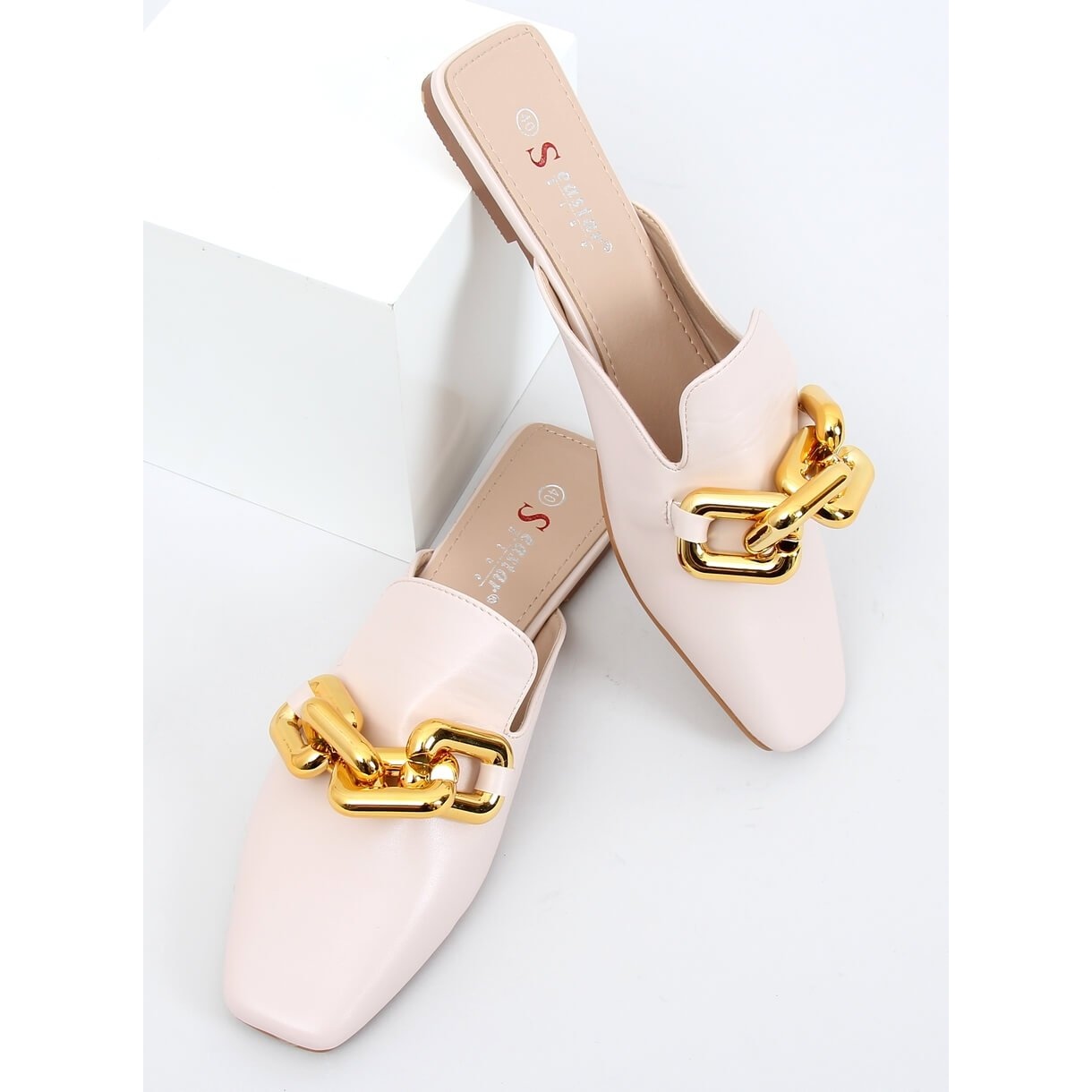 Ekologisesta nahasta valmistetut maukkaita naisten tossut, joissa yhdistyvät klassinen yksinkertaisuus muodikkaisiin yksityiskohtiin. Malli erotetaan tyylikkäästä kultaketjusta, joka on sijoitettu etuosaan ja moderni neliömäinen nenä - tämän kengät näyttävät naisellisilta ja erittäin muodikkaalta. Litteä pohja ja pehmeä ekologinen hölynpöly varmistaa mukavuuden jopa pidemmän käytön aikana.