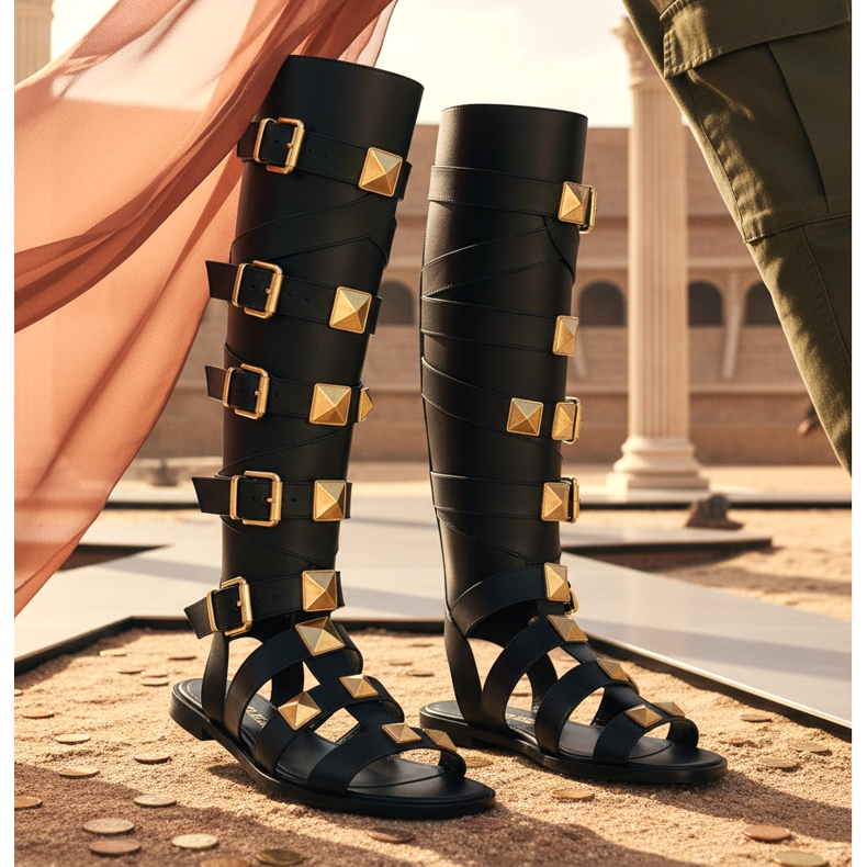 Hieman dramaattisempi ja näyttävämpi. Niiden olkaimet ulottuvat pohkeen puoliväliin luoden vahvan visuaalisen aksentin. Ne näyttävät upeilta minimekkojen tai shortsien kanssa – paljaan ihon kontrasti ja hihnojen tarkka kuvio antaa upean vaikutelman.