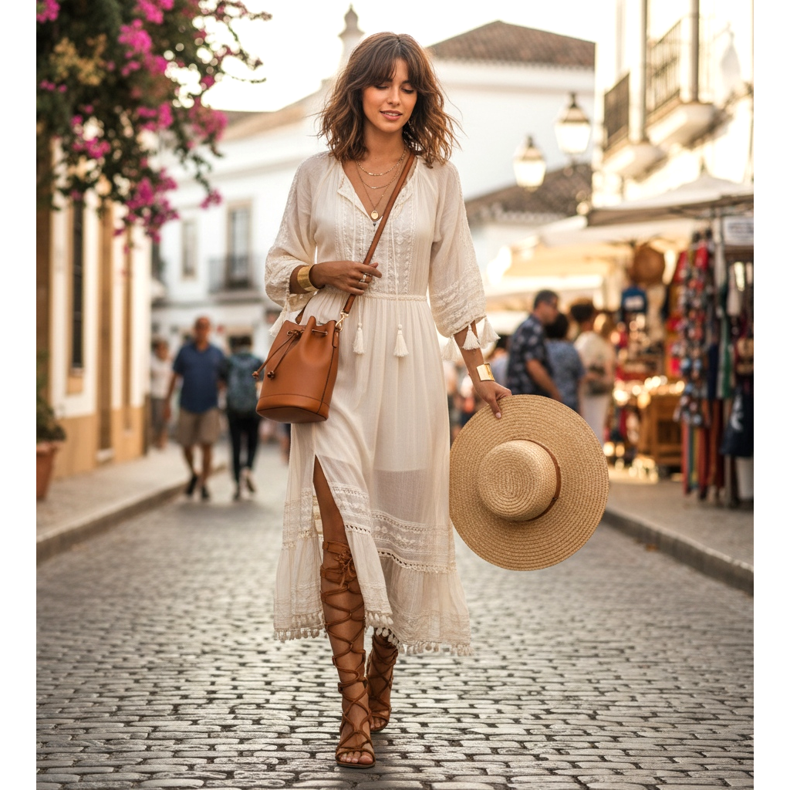 Ilmava boho-tyylinen mekko brodeerauksella tai hapsuilla harmonisoituu luonnollisesti gladiaattorikenkien nahkaestetiikkaan. Valitse konjakki- tai luonnonruskeat sandaalit ekrun-, terrakotta- tai tummanvihreän sävyisen mekon kanssa. Tämä setti toimii sekä rantakurssilla että kesämessuilla tai vernissageilla.