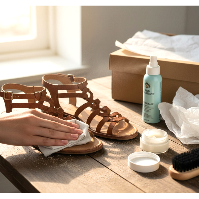 Kesällä käytetyt sandaalit altistuvat paljon intensiivisemmälle kosketukselle ulkoisten tekijöiden kanssa kuin talvisaappaat - hiki, vesi, hiekka, aurinkovoide. Säännöllinen hoito on avainasemassa, jotta gladiaattorikengät näyttävät kauniilta koko kesän ja useana vuodenaikana.