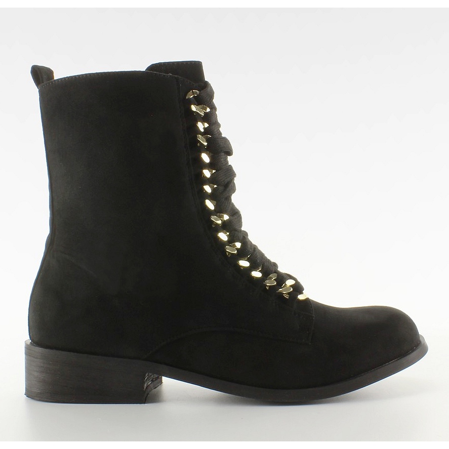 Tyylikkäät naisten työntekijöiden saappaat pehmeästä ekologisesta mokkanahkasta. Mallissa yhdistyy sotilaallinen luonne ja eleganssi - ohut leikkaus ja pyöreä varvas sopivat mukavasti jalkaan. Tiheä nyöritys kulkee ketjunmuotoisten silmien läpi, ja käytännöllinen vetoketju sisäpuolella helpottaa pukemista nopeasti. Eristys ja litteä, 3 cm kantapää tekevät kengistä sopivat myös kylmempään päivään.