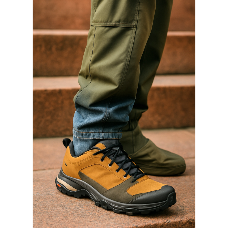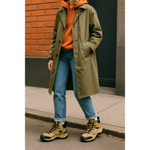 Gorpcore-tyyli on aitoutta ja mukavuutta. Vaelluskengät (esim. Salomon, Merrell tai Timberland) yhdistetään arkivaatteisiin, ei täydellisiin kiipeilyvarusteisiin. Ne näyttävät hyvältä leveiden laukkufarkkujen, taskuhousujen tai teknisistä materiaaleista valmistettujen verryttelypukujen kanssa. On tärkeää, että kokonaisuus näyttää huolettomalta ja toimivalta, ei naamioitua.