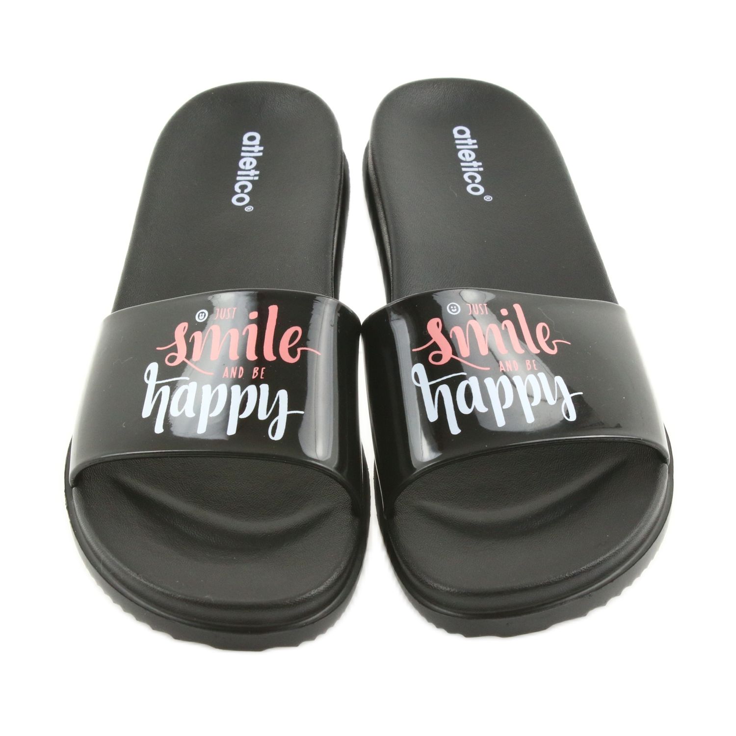 Universaalin ulkonäön ansiosta Happy Atletico -varvastossut sopivat täydellisesti uimiseen, suihkuun ja ulkoiluun. Hallitseva kuvio ja mielenkiintoiset kirjoitukset antavat niille muodikkaan luonteen, ja lakattu viimeistely lisää eleganssia.