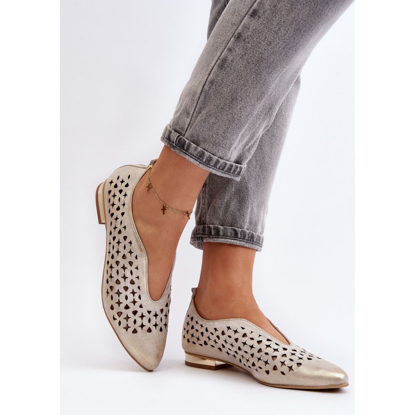 Löydä eleganssi ja mukavuus Openwork Ballerinas -mallin Zazoo Gold! Nämä ainutlaatuiset naisten balleriinit, jotka on valmistettu korkealaatuisimmasta luonnonahasta, yhdistävät klassisen tyylin ja modernin suunnittelun. Heidän mantelin nenänsä optisesti ohut jalat, ja avoimien yläosien yläosa antaa heille keveyden ja tuoreuden, joka sopii täydellisesti kevään kesän suuntauksiin.