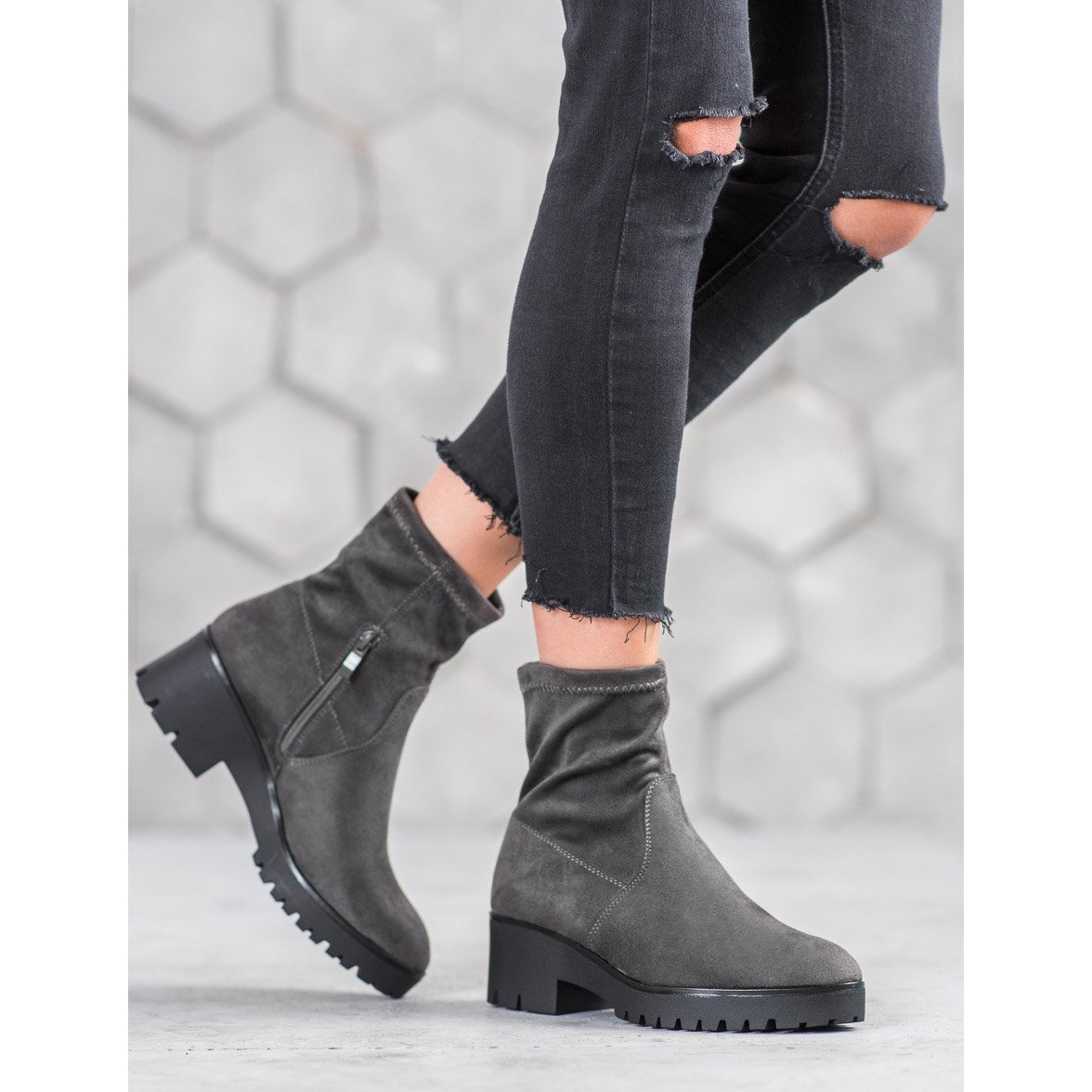 Lisää tyyliä ja mukavuutta vaatekaappiisi SHELOVET-nilkkureilla harmaalla. Nämä muodikkaat ja käytännölliset naisten kengät on valmistettu korkealaatuisesta ekologisesta mokkanahkasta, mikä tekee niistä paitsi esteettisiä myös ympäristöystävällisiä. Kiinteän kulutuspinnan ansiosta voit nauttia mukavuudesta ja vakaudesta kävellessäsi.
