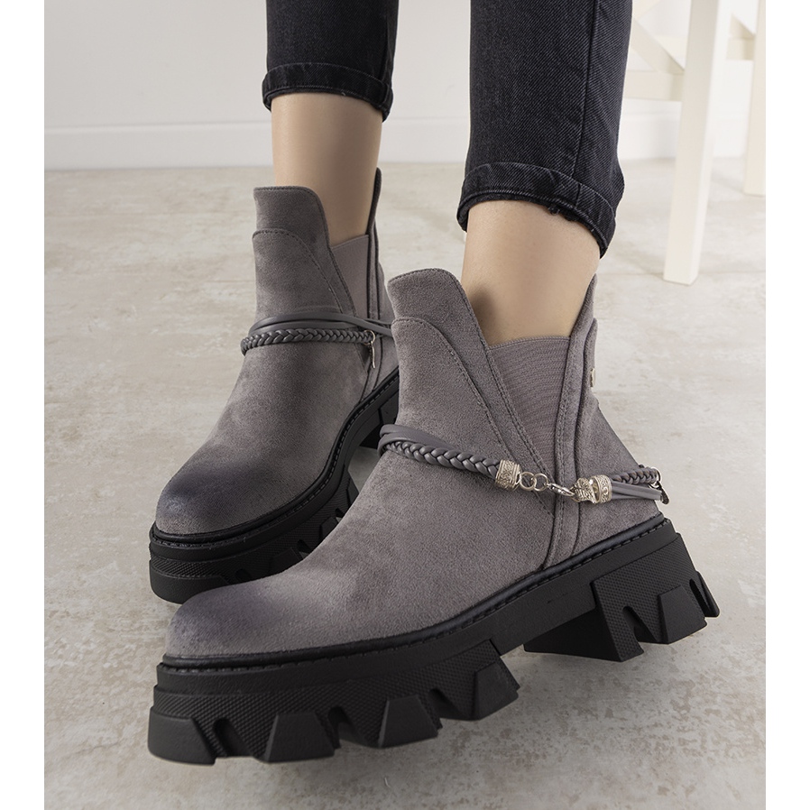 Harmaat nilkkurit, joissa on Fearless-rannekoru, ovat jokaisen naisen vaatekaapissa välttämättömiä nilkkureita, joissa eleganssi yhdistyy moderniin tyyliin. Valmistettu korkealaatuisesta mokkanahkasta, ekologisesta nahasta, ne erottuu ainutlaatuisesta muotoilusta, jonka nenässä on kulunut vaikutus, mikä lisää niihin luonnetta ja ainutlaatuisuutta.