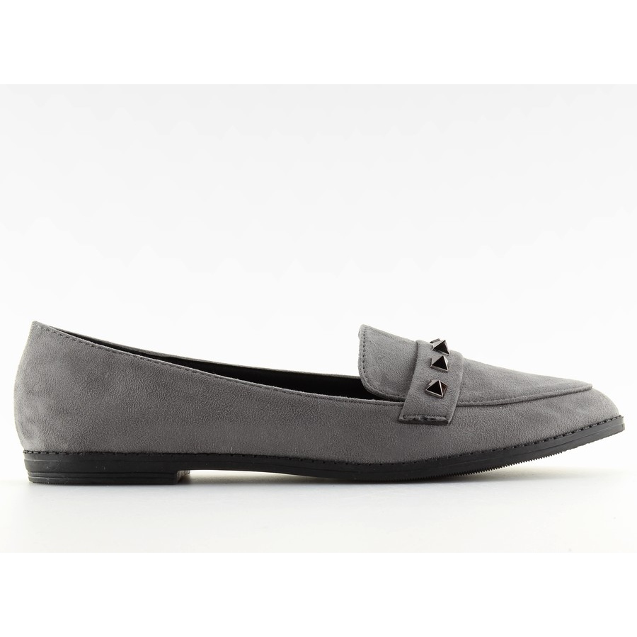Tyylikkäät, harmaat naisten mokasiinit nappeilla - täydelliset siirtymäkausiin. Ekologisesta mokkanahkasta valmistetut ne korostavat jalan kapeaa linjaa, ja jalkaterän koristenauha metallinappien kanssa antaa niille erottuvan luonteen. Klassinen, pyöristetty kärki ja matala kantapää (1 cm) takaavat arjen mukavuuden, ja slip-on muotoilu helpottaa pukemista nopeasti.