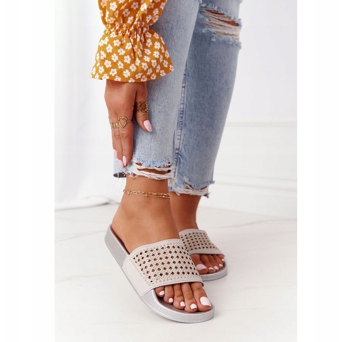 Tutustu kesäiseen eleganssiin muodikkaan harmaan värisillä EVE Tonya -kumivarvastossuilla, jotka on koristeltu paljeteilla! Nämä naisten varvastossut ovat ihanteellinen valinta naisille, jotka arvostavat mukavuutta ja tyyliä jokapäiväisessä käytössä. Slip-on-kiinnityksen ansiosta ne on helppo pukea ja riisua, mikä tekee niistä täydellisen valinnan rannalle, kävelylle kaupungissa tai rentoutumiseen puutarhassa.