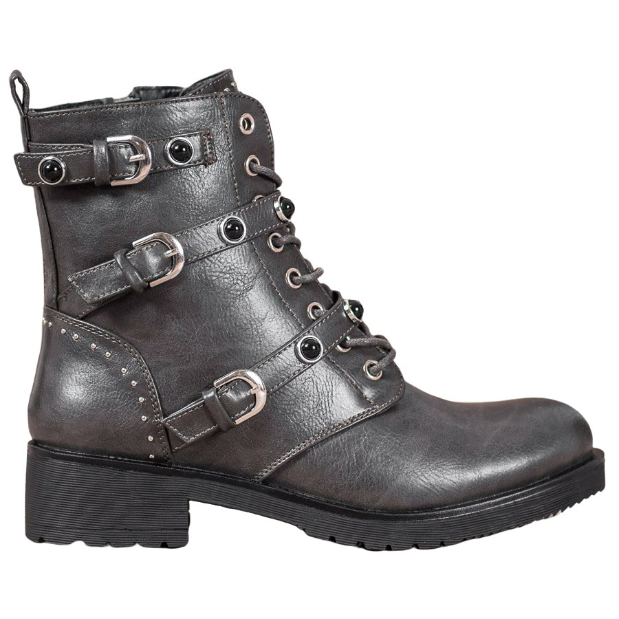 Tyylikkäät harmaat Cm Paris -työntekijät ovat täydellinen valinta naisille, jotka haluavat yhdistää mukavuuden muodikkaan lookin. Niiden päälliset ulottuvat nilkan yläpuolelle, nyöritysten ja sivussa olevan vetoketjun yhdistelmä tekevät niistä paitsi esteettisiä myös toimivia. Koristeelliset vyöt soljilla, jotka on koristeltu strassikivillä, antavat niille rock-luonteen, joka sopii täydellisesti tämän hetken trendeihin.